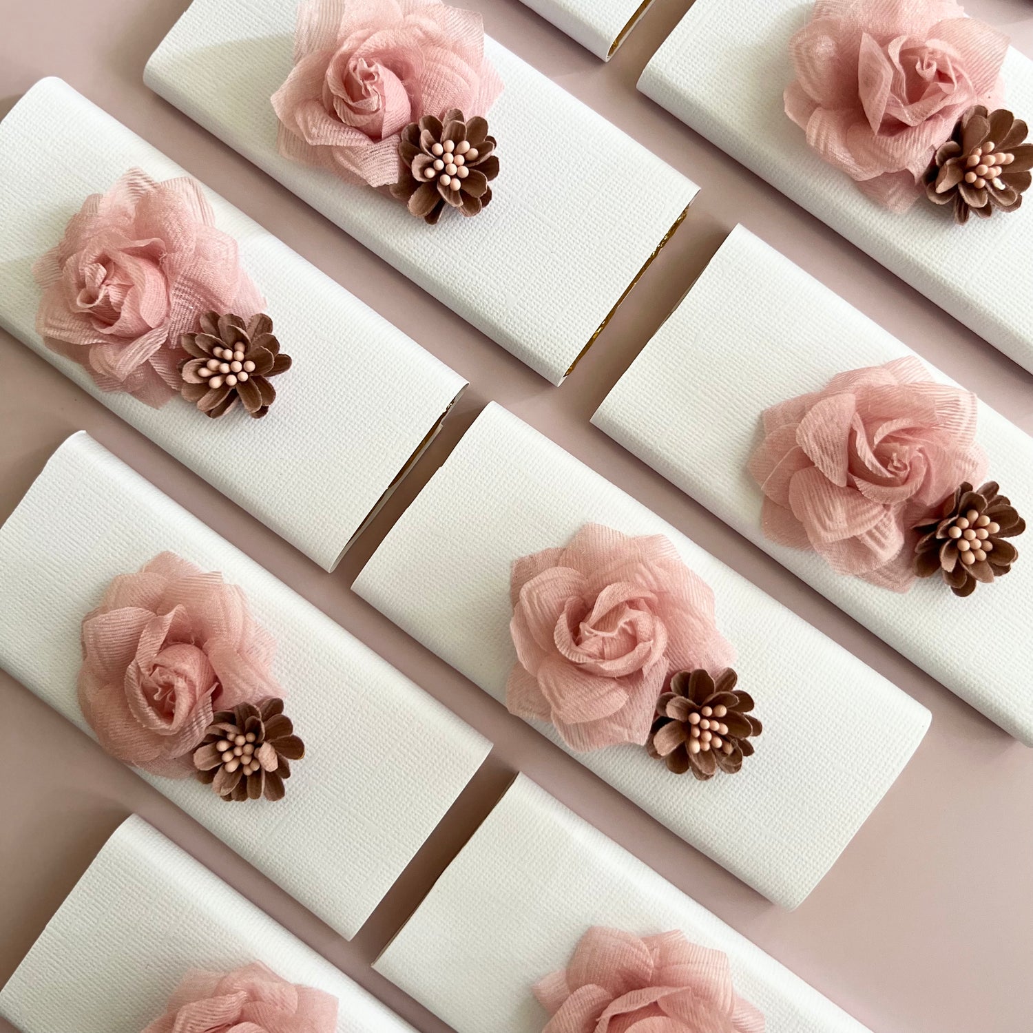 Let us make your next event stand out with these gorgeous rectangle chocs finished off with a textured wrap and combination of stunning floral.