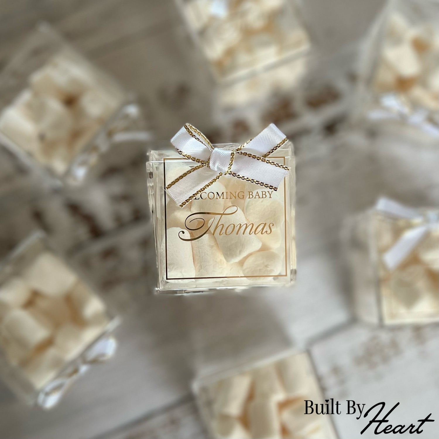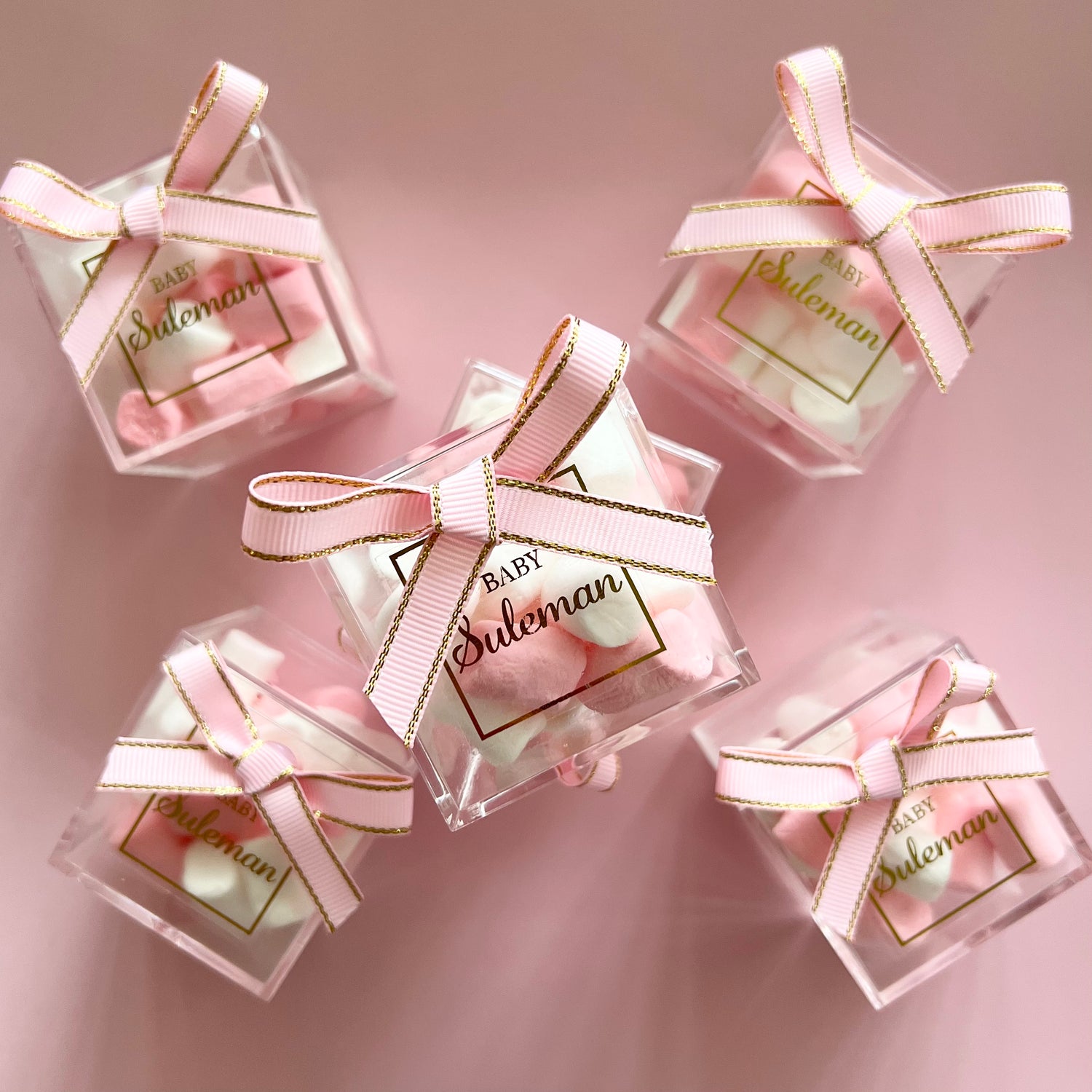 Let us make your next event stand out with these gorgeous Marshmallow acrylic boxes measuring approx 4.5cm X 4.5cm finished off with a pretty bow and personalised sticker.