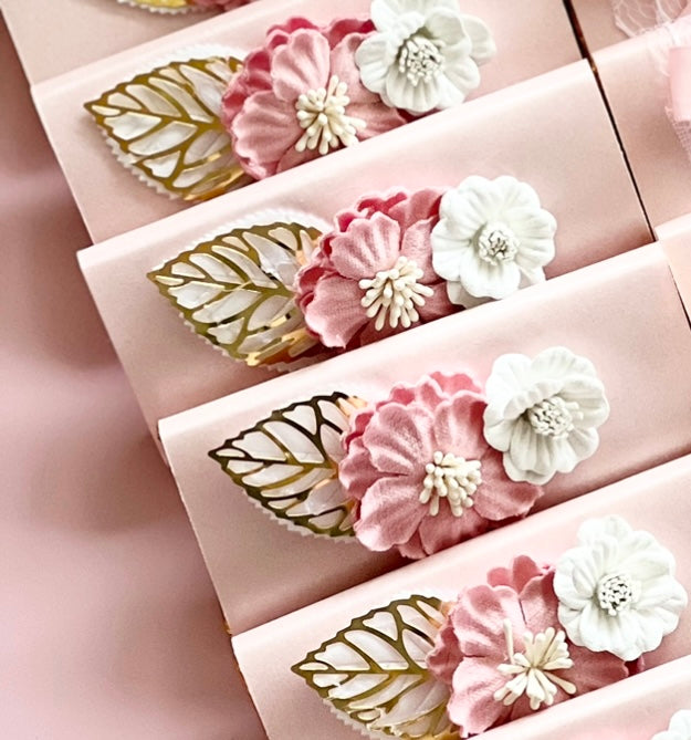 Let us make your next event stand out with these gorgeous rectangle chocs finished off with a textured wrap and combination of stunning floral & leaves.