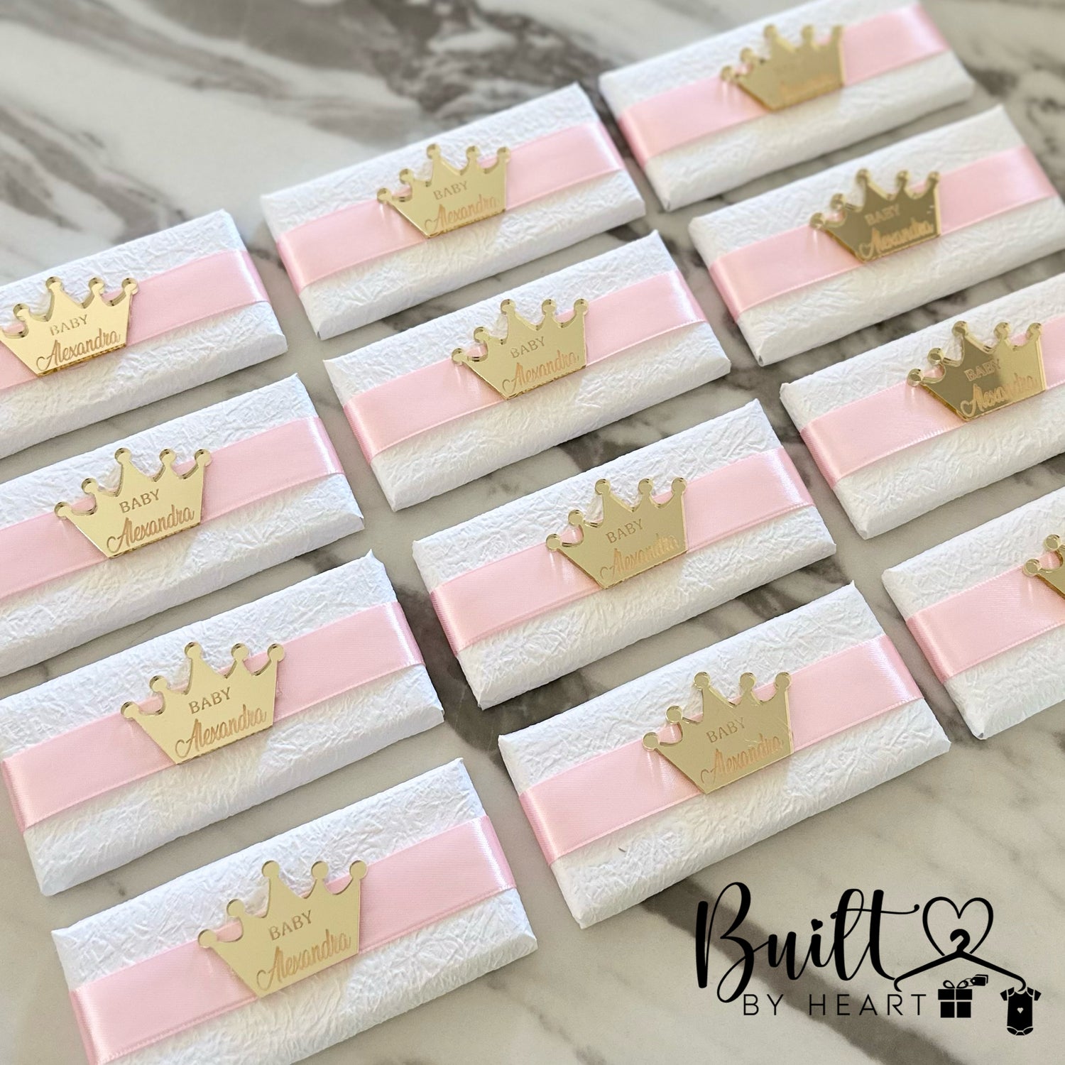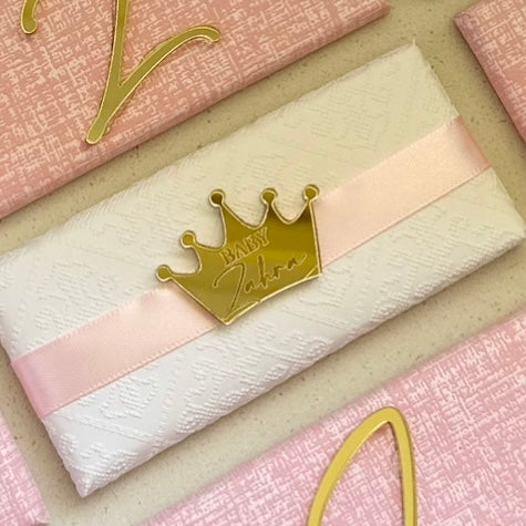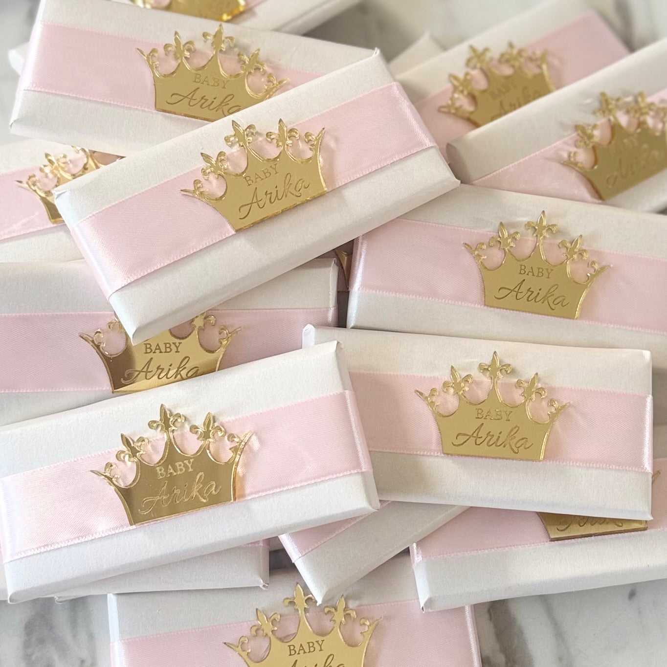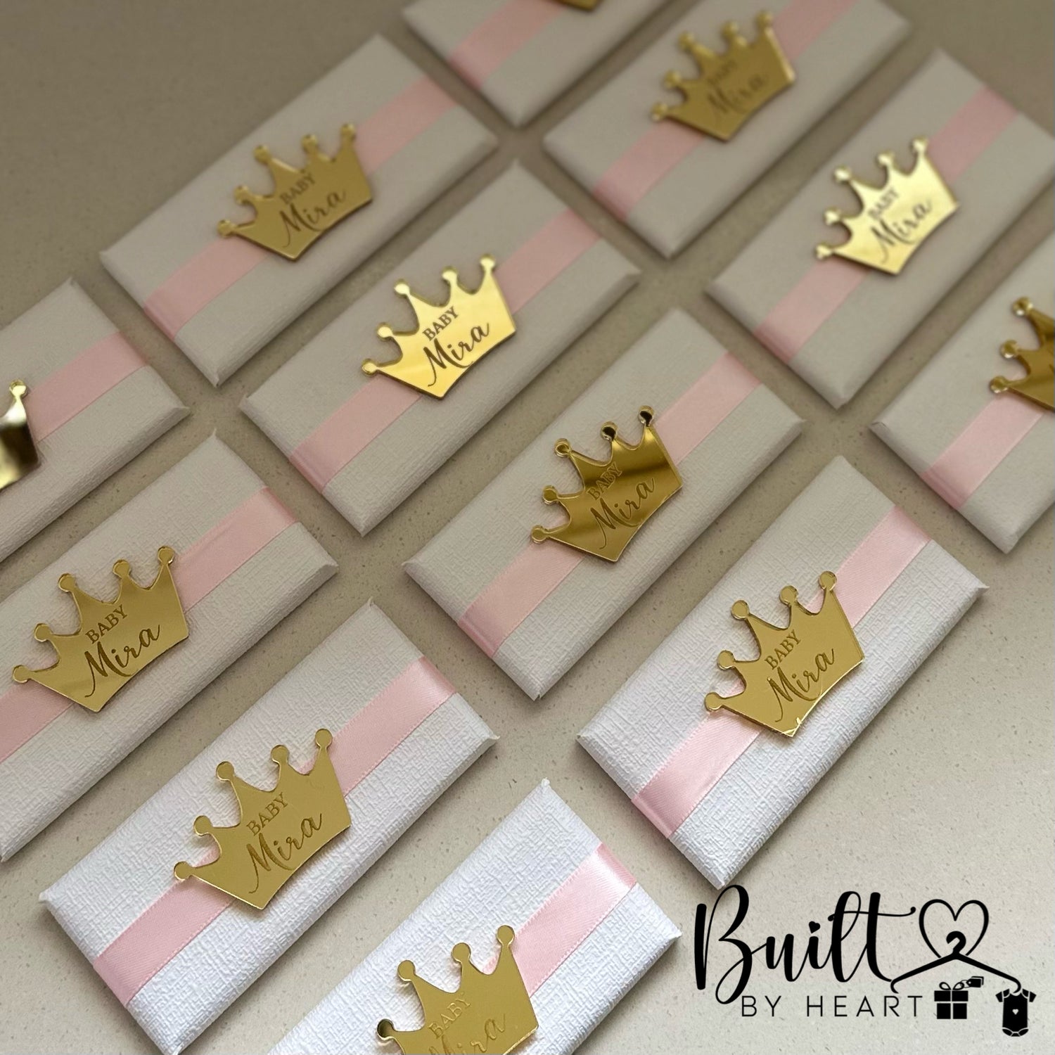 Let us make your next event stand out with these gorgeous rectangle chocs finished off with a textured wrap, ribbon & Personalised crown shape acrylic.