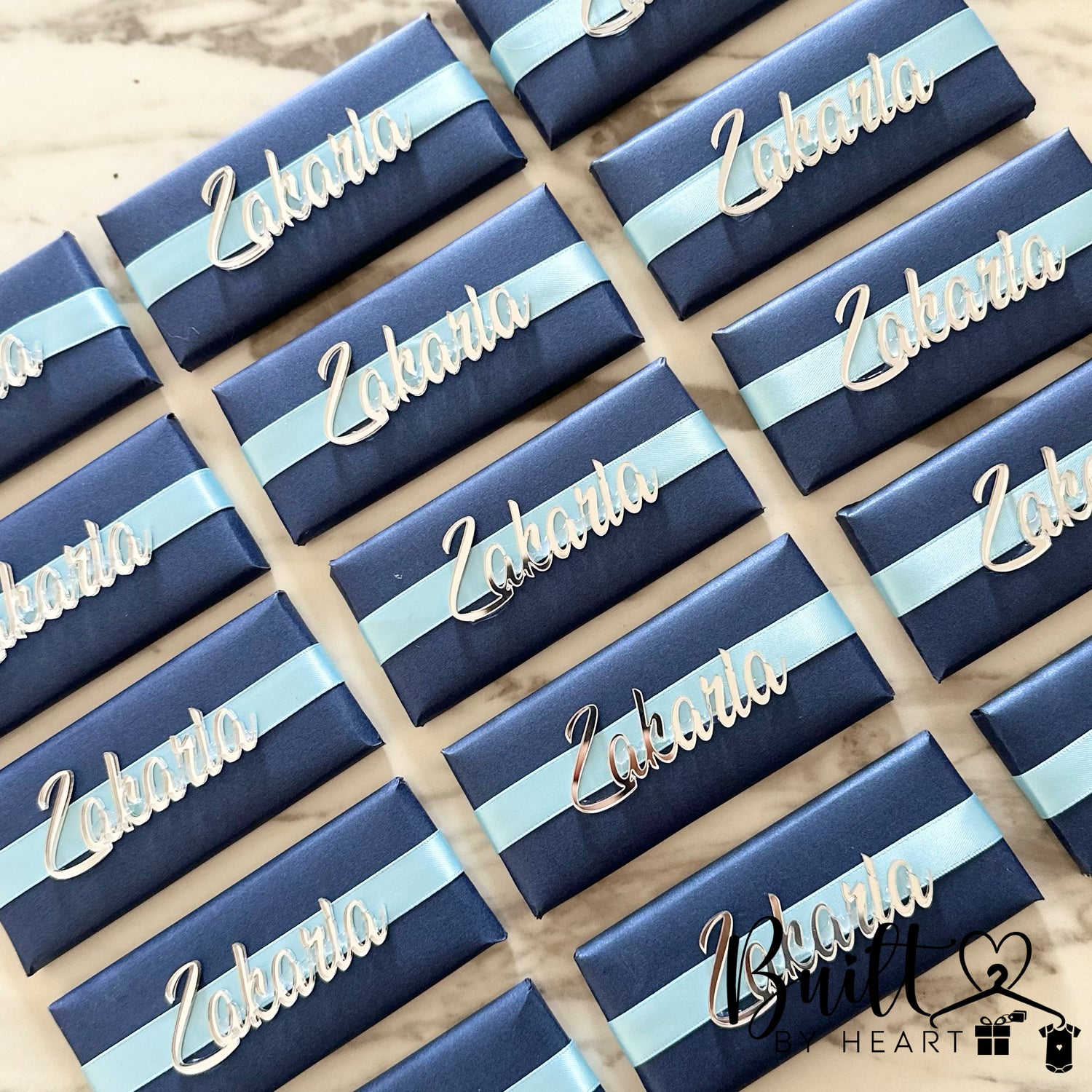 Let us make your next event stand out with these gorgeous rectangle chocs finished off with a textured wrap, ribbon & personalised acrylic name.
