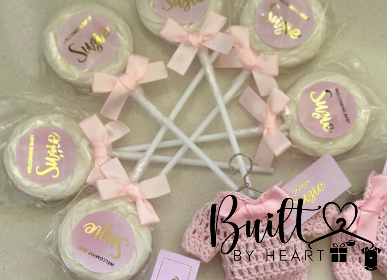 Add that extra touch to your favour stand with our personalised lollipops - approximatley 5cm in diameter finished off with a personalised sticker & bow.