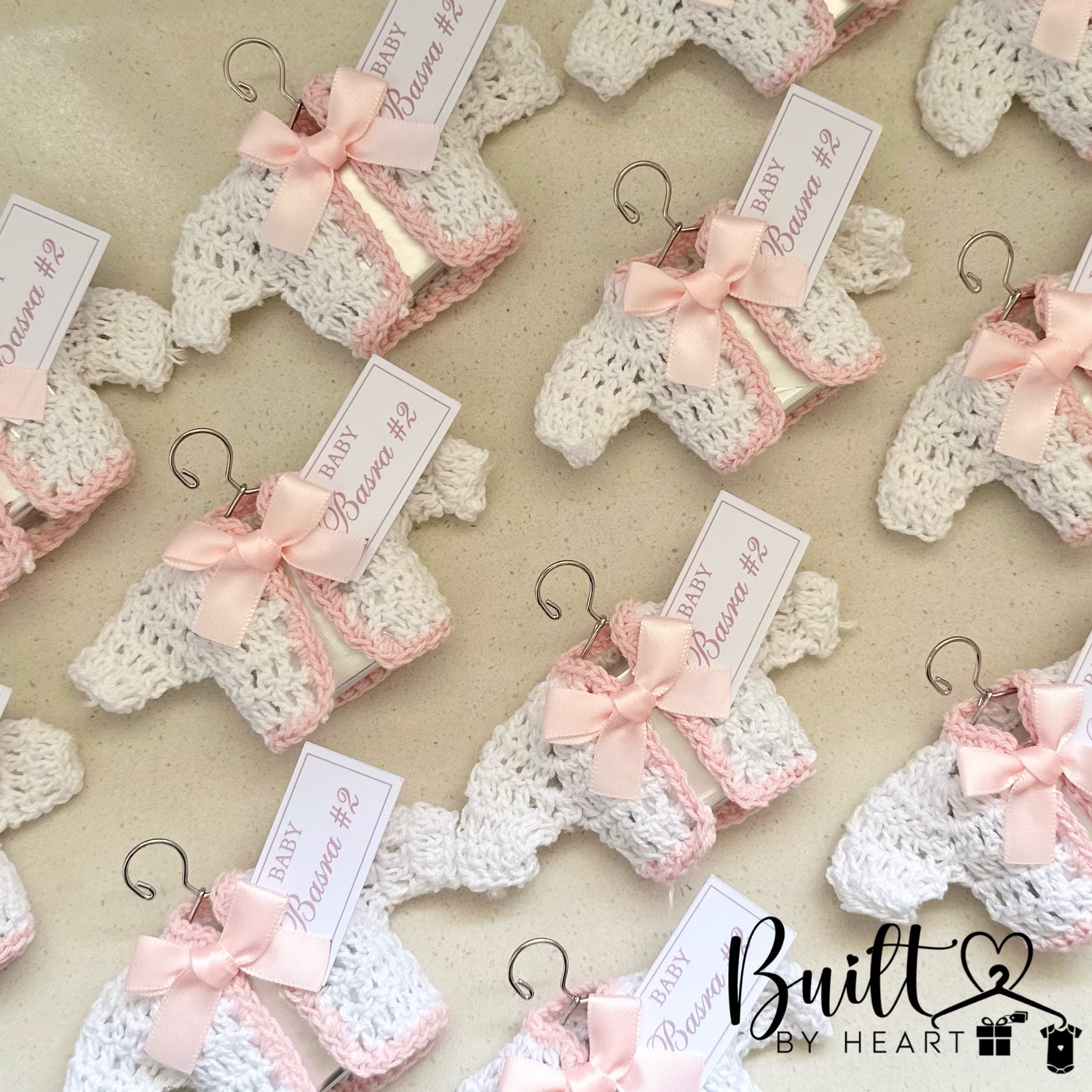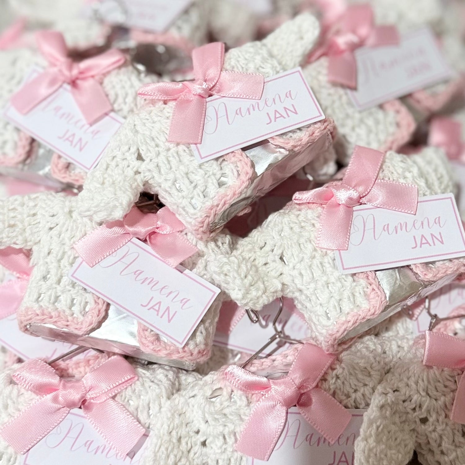 Let us make your next event stand out with these adorable mini knit choc cardigans finished off with a personalised tag, bow & mini coat hanger.