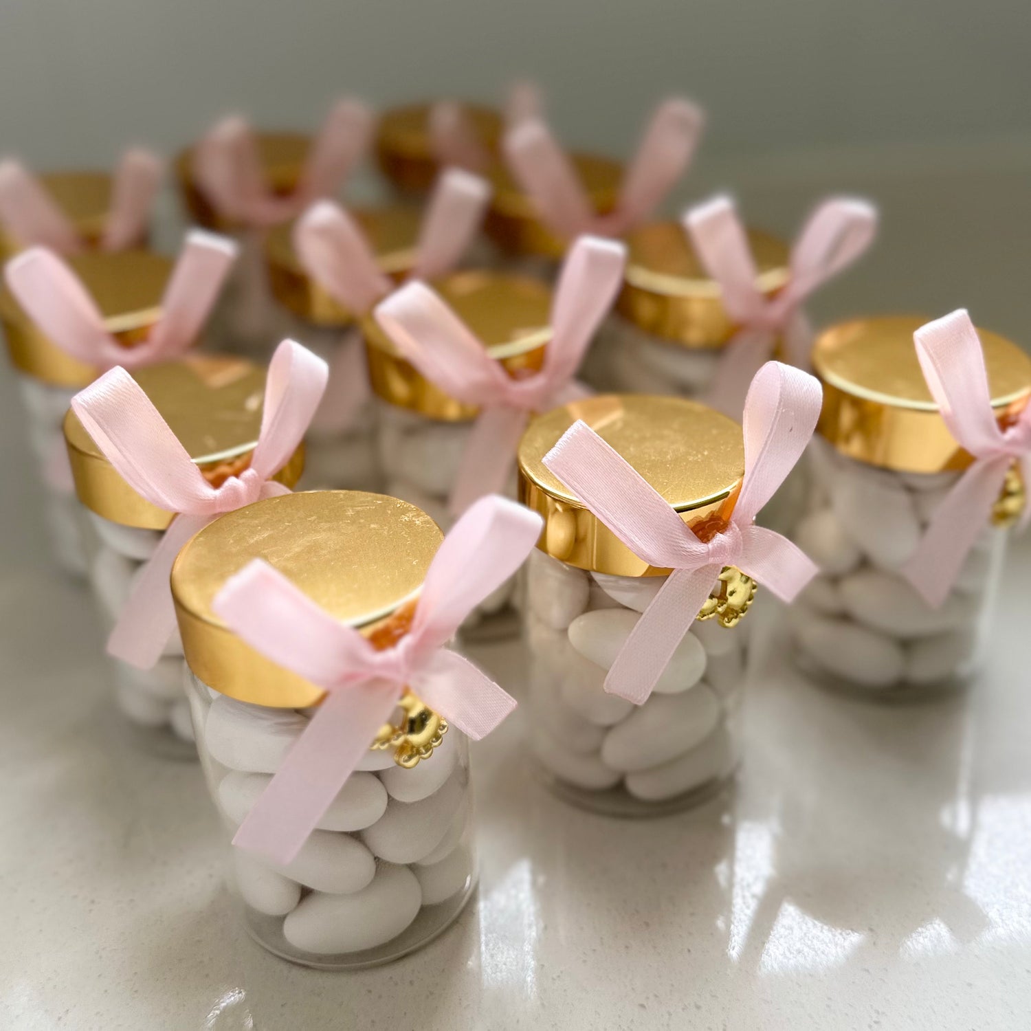 Let us make your next event stand out with these gorgeous mini glass bottles filled with white choc almonds and finished off with a bow and charm.