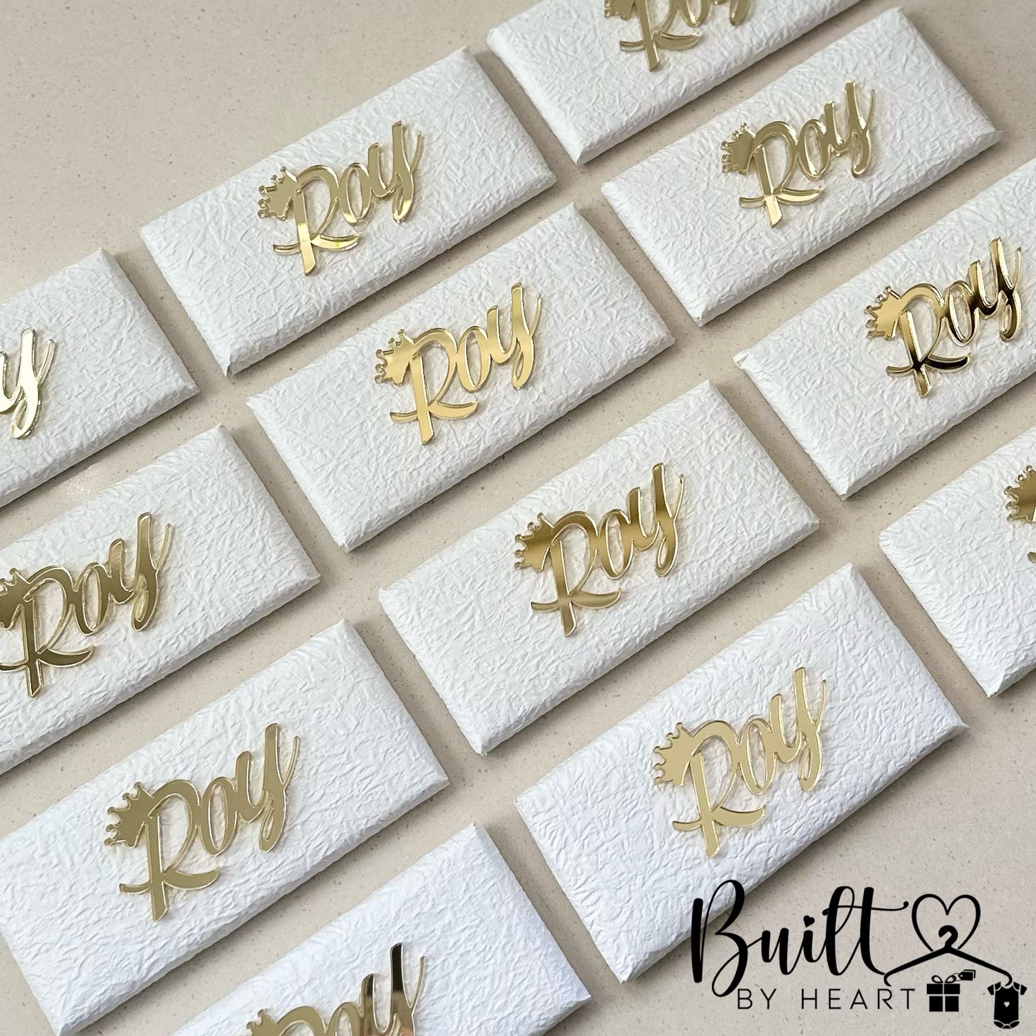 Let us make your next event stand out with these gorgeous rectangle chocs finished off with a textured wrap & personalised acrylic name.