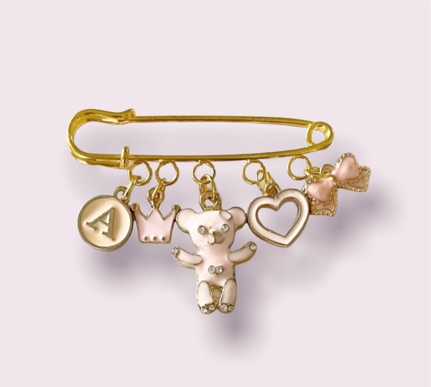 Brooch pins are personalised to add that extra touch to baby clothing, pram , blanket etc.