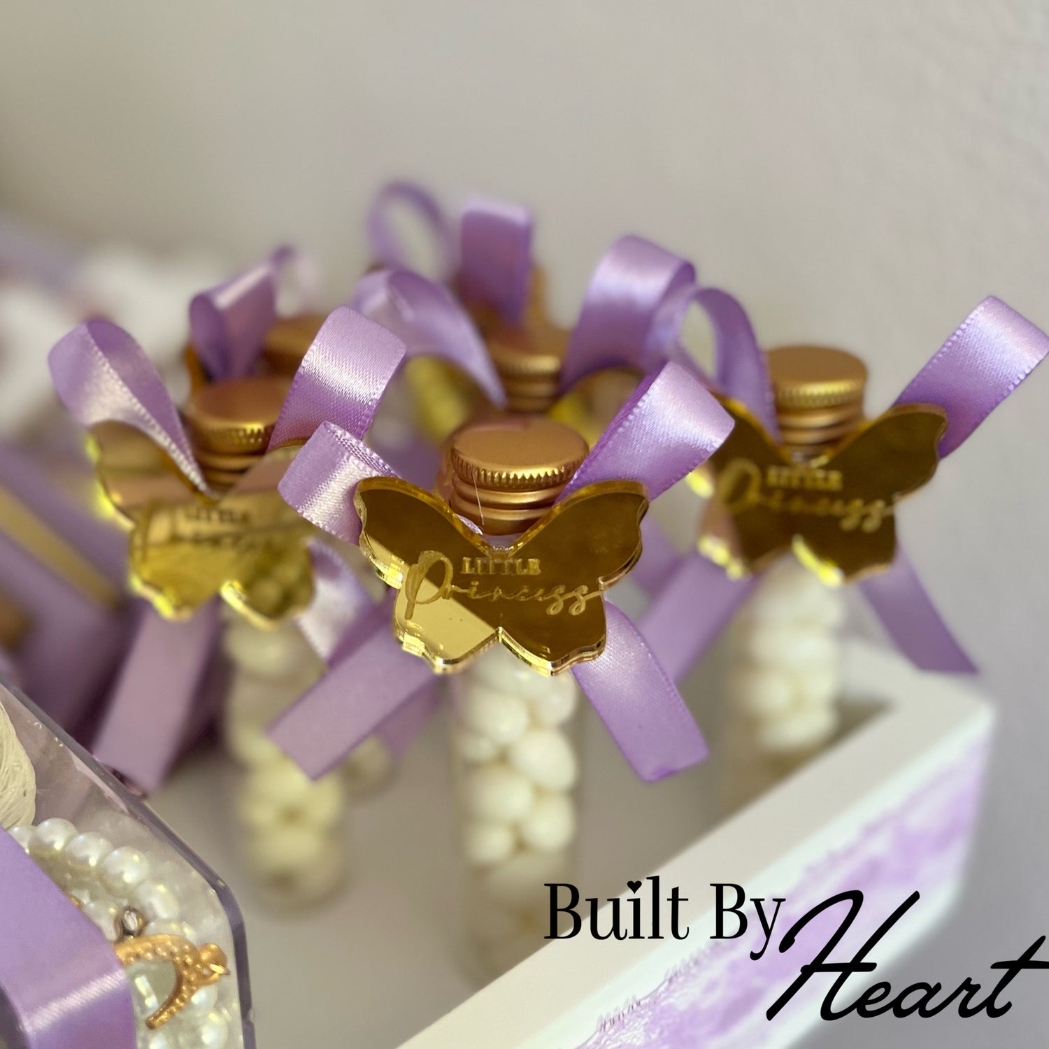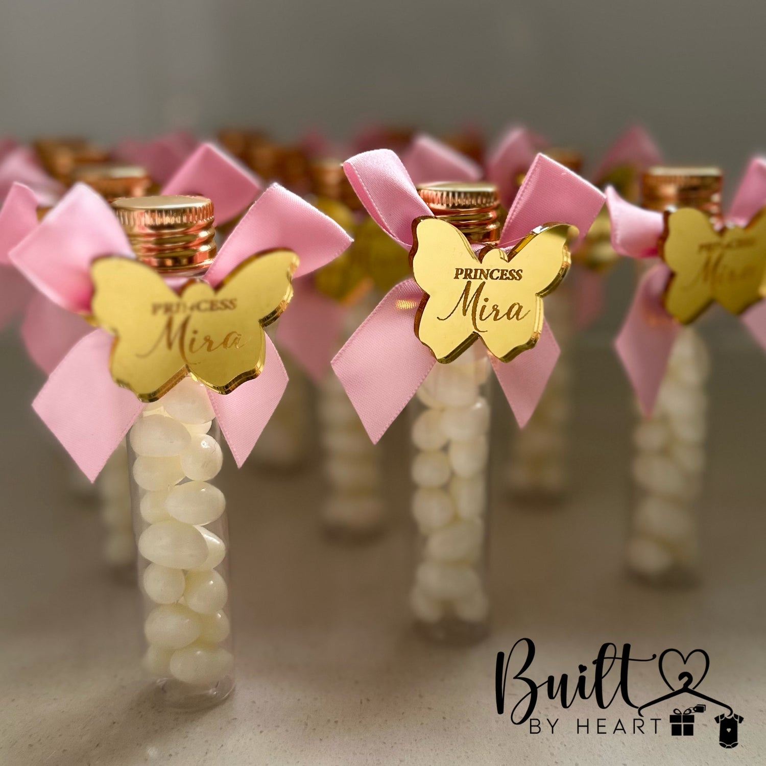 Let us make your next event stand out with these adorable tubes filled with tasty jellybeans & finished off with a gorgeous bow & acrylic piece