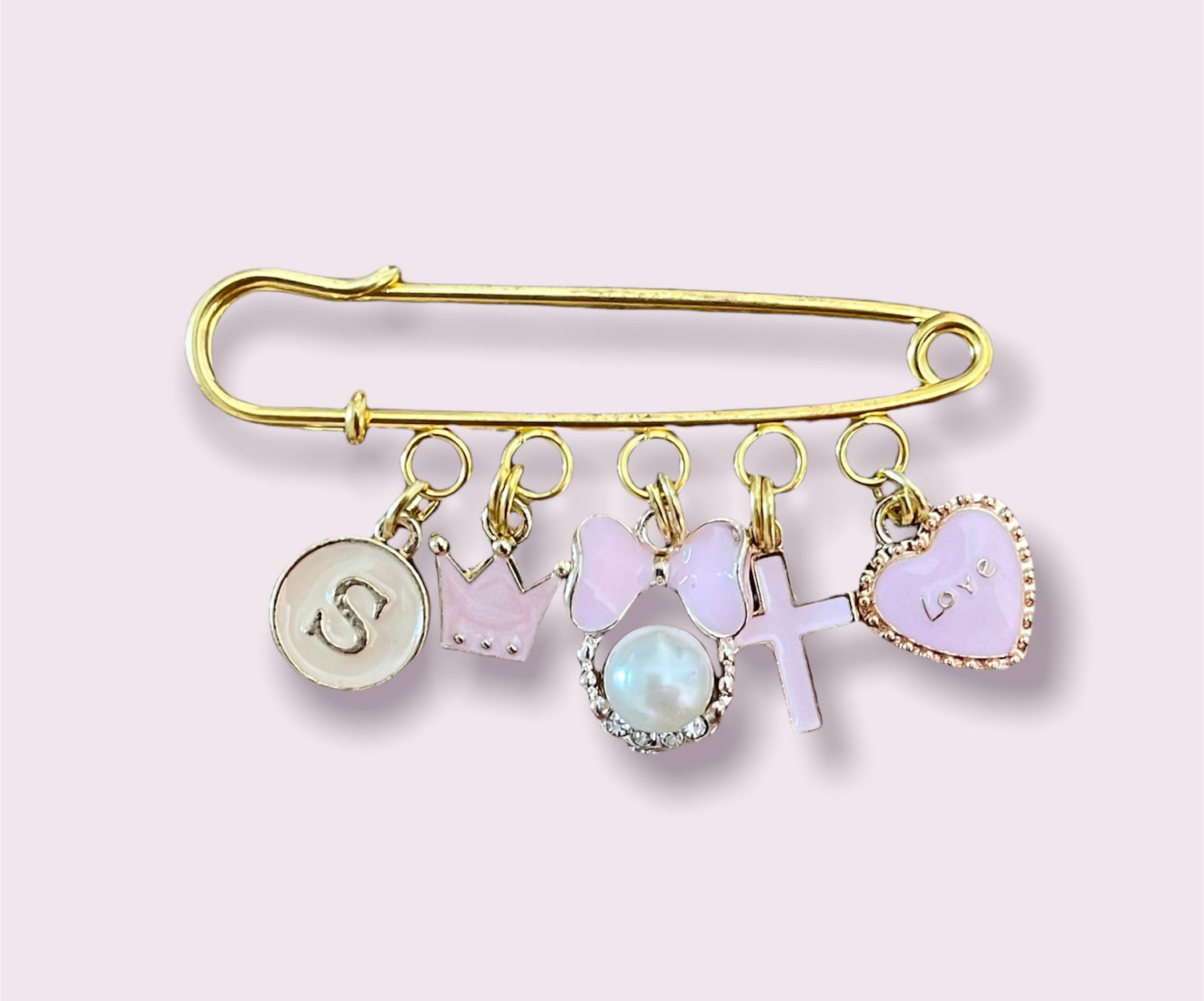 Brooch pins are personalised to add that extra touch to baby clothing, pram , blanket etc.