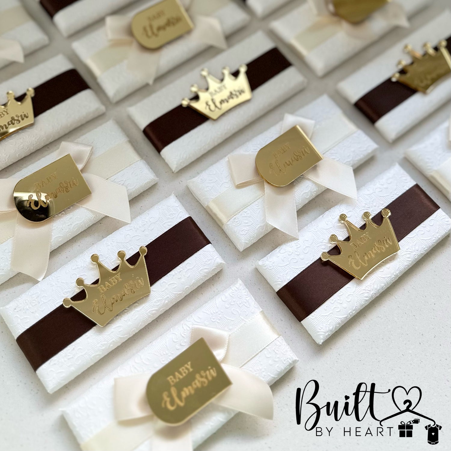 Let us make your next event stand out with a mix of these gorgeous rectangle chocs finished off with a textured wrap & personalised acrylic crown/arch.