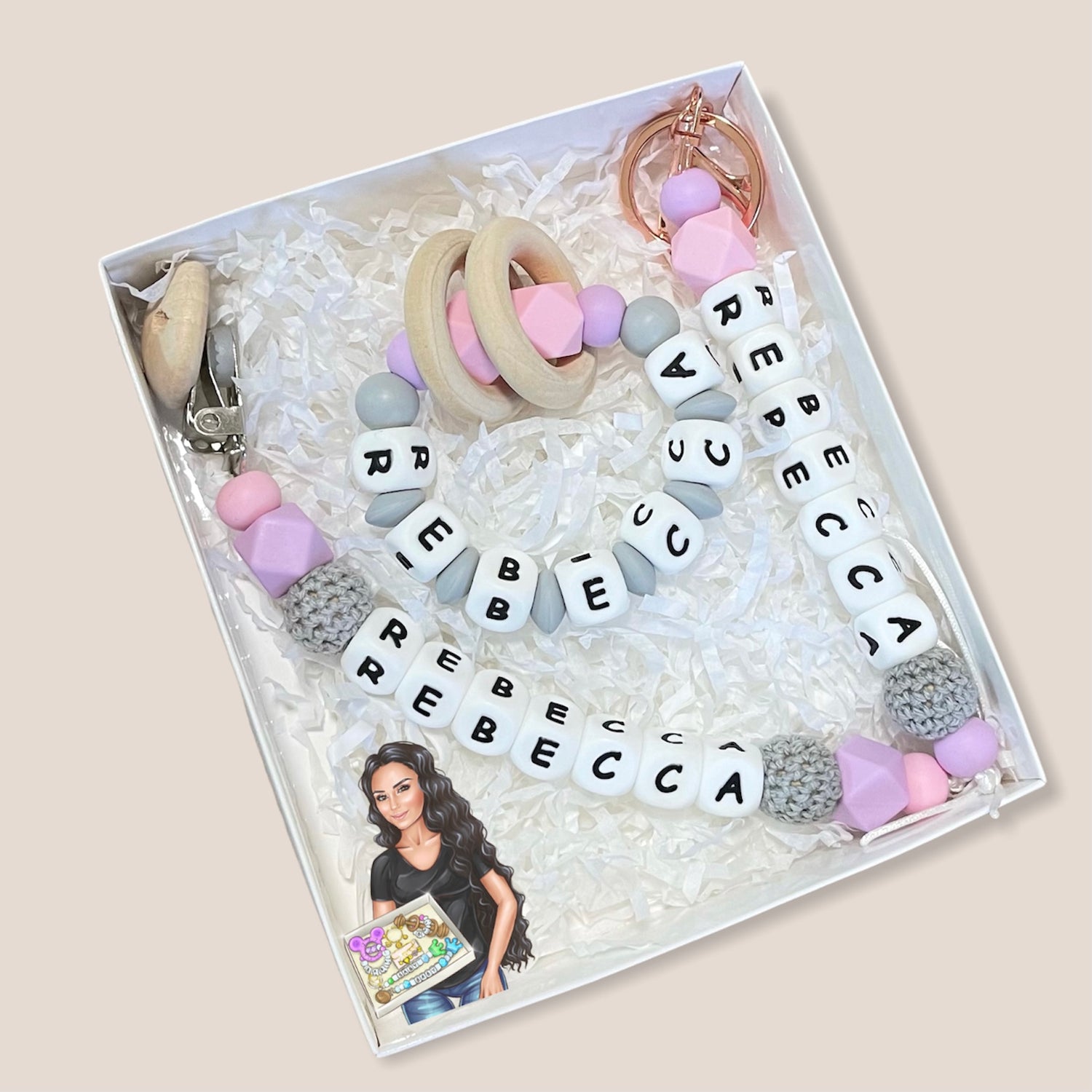 - 1x personalised teething ring